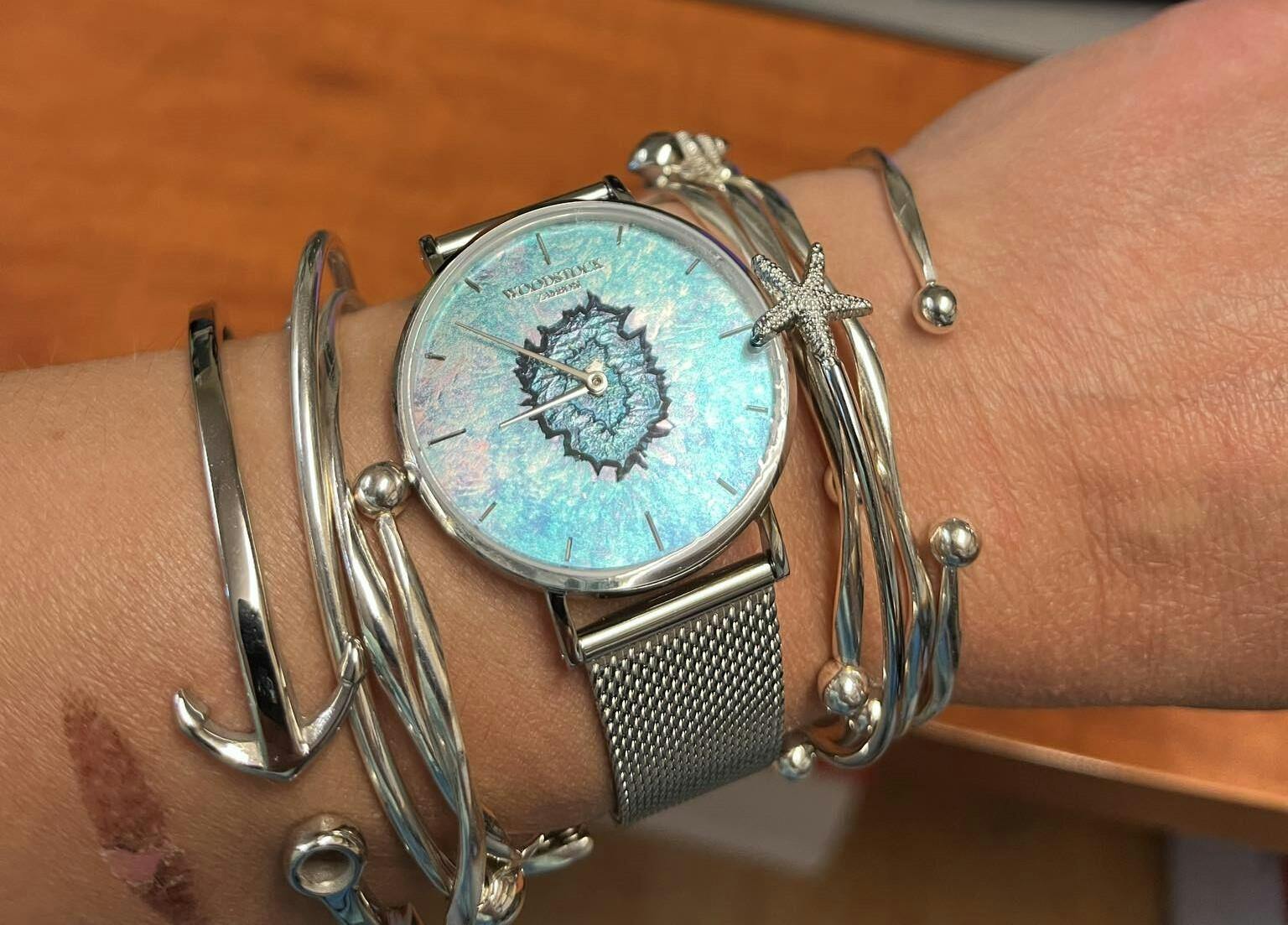 This set includes the Marmoris watch and two silver-toned waterproof bracelets: one with a shell, one with an anchor. Symbols of water, grounding and journey, they complete a set that feels like the ocean in motion.