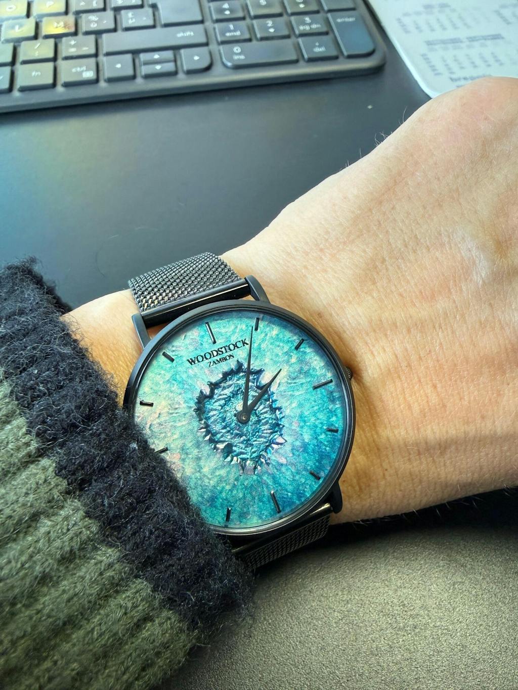 Chaque montre est un micro-univers : des reflets turquoise et violets qui rappellent l’océan, jusqu’au centre sombre et magnétique qui attire le regard.