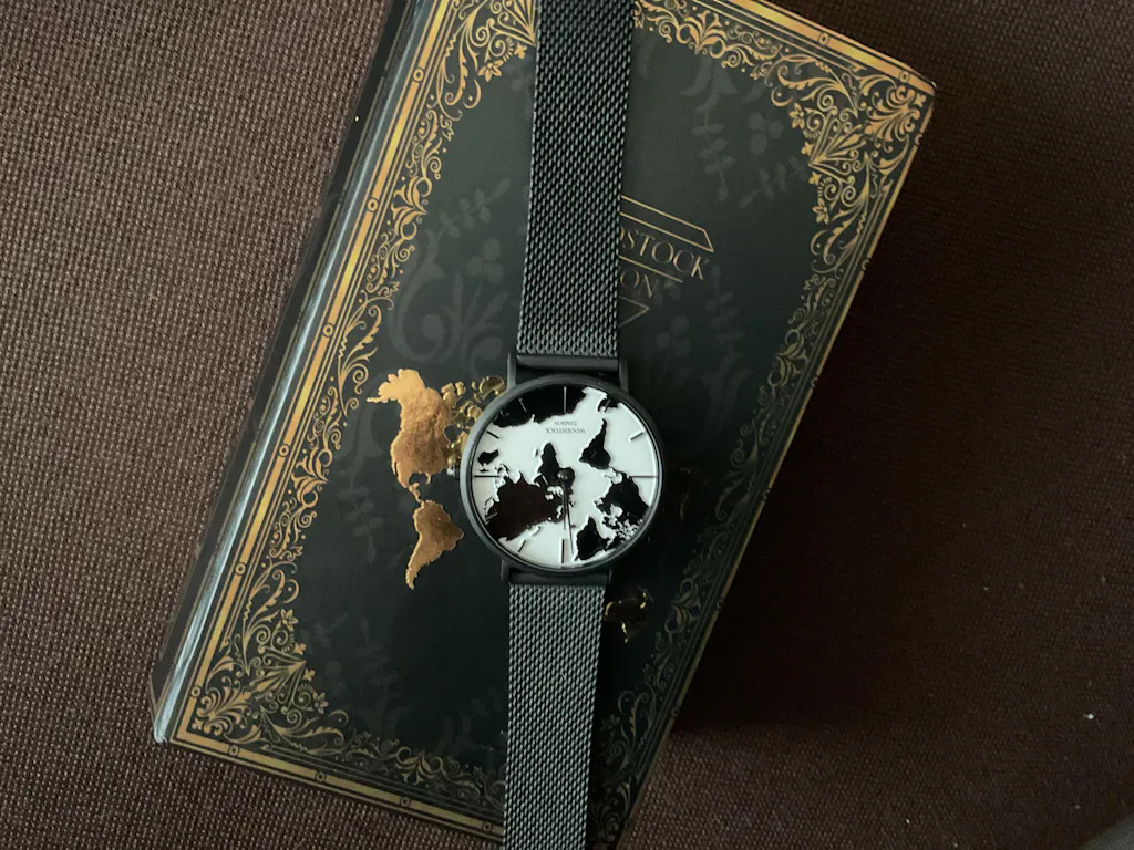 Classic World is a tribute to the power of simplicity a clean white dial enhanced by a bold black world map.